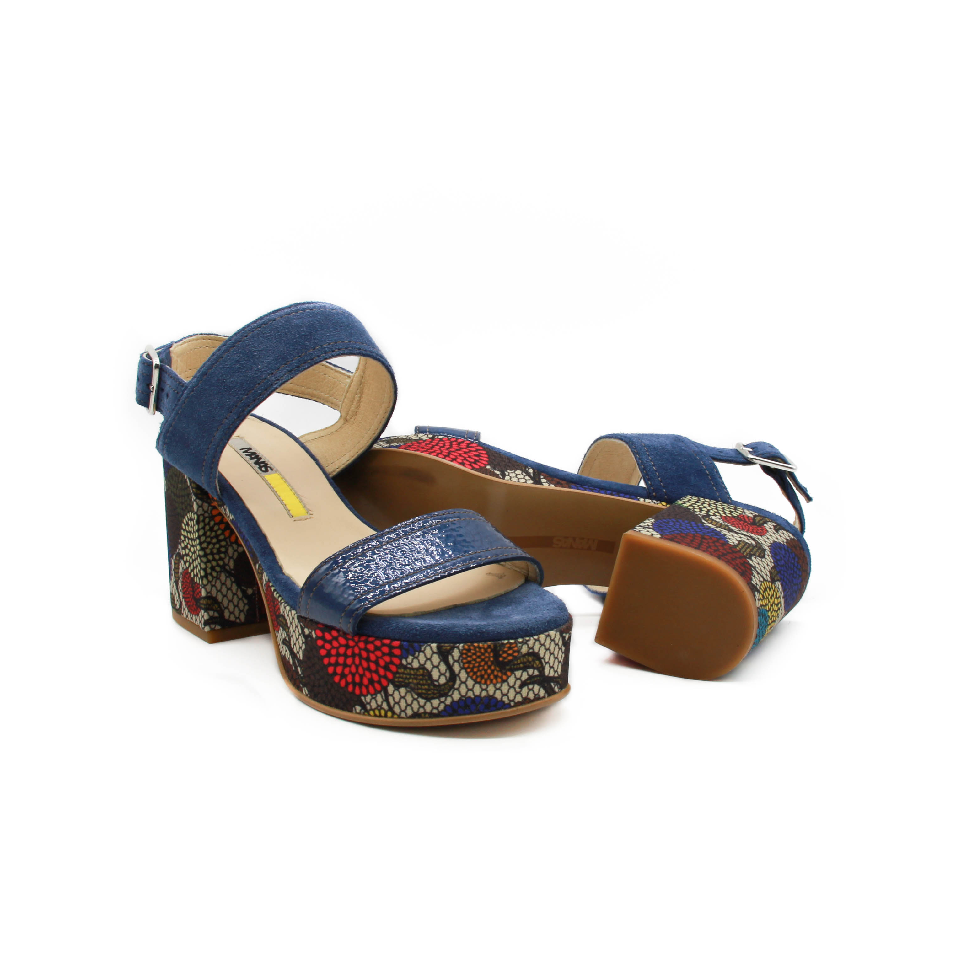 красивые босоножки на платформе и удобном, устойчивом каблуке. платформа и каблук обтянуты яркой тканью.